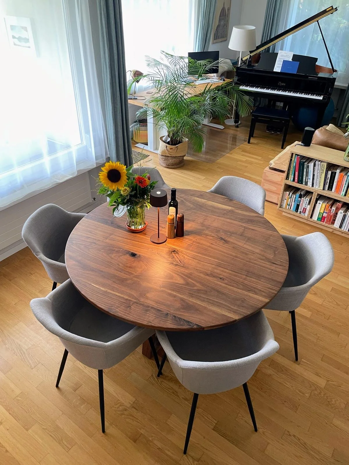 We love to get creative with our hands to create unique wooden tables. With the idea of bringing nature into the dining room, we created a round walnut table with a tripod leg in the centre that carries a massive stone. The edge of the table is trimmed to give the table a thinner look and feel. The diameter of the table is 140 cm and can comfortably seat 6-7 people. No matter how many people are eating, no one will be left alone at the end of the table and everyone will be close to the fondue in the middle